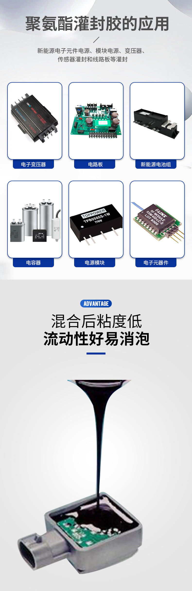 ● 廣泛應(yīng)用于變壓器、電器,AC電容、高壓包、負離子發(fā)生器、水族水泵、點火線圈、電源模塊、電子控制器及其它電子元器件的灌封;